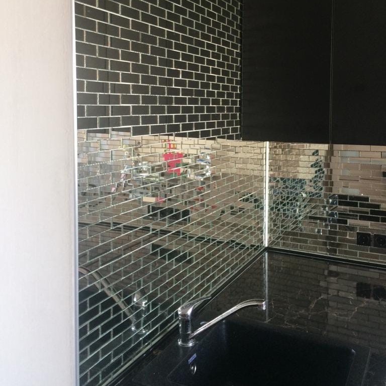 Использована серебристая квадратная зеркальная плитка размером 18х18.